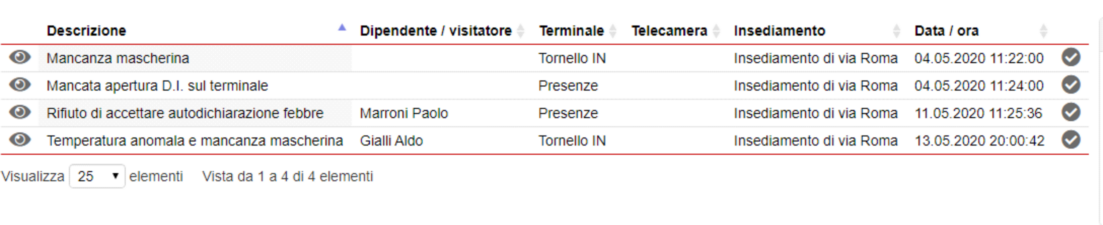 | • | : questa immagine è un pulsante che ti permette di chiudere l’allarme, significa che l’utente ha preso nota dell’allarme, ha agito come da protocollo e sposta il record nella tabella ALLARME_GESTITO; |