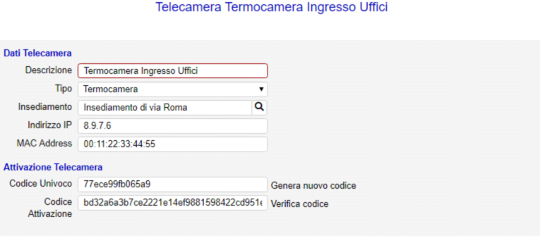 Poniamo subito attenzione alla parte sottostante della maschera quella denominata Attivazione Telecamera, perché per inserire un nuovo oggetto nell’impianto prima deve essere attivata, con le stesse modalità usate per il modulo allarmi, altrimenti all’oggetto non sarà consentito lo scarico dei dati;