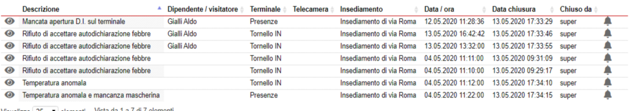 Cliccando sulla voce Storico allarmi si apre l’elenco sotto rappresentato; lo storico allarmi sono i dati presenti nella tabella ALLARME_GESTITO, quelli, come detto sopra, che da allarmi attivi sono stati chiusi dall’utente.