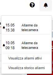 se lampeggia, cioè alterna il colore da nero a rosso e viceversa, significa che ci sono degli allarmi attivi nel sistema; al click si presentare il menù sotto riportato: un elenco di allarmi attivi, ordinati in maniera decrescente per data e ora dell’accaduto, con la descrizione; notare bene che se l’allarme si è verificato nei giorni precedenti, prima dell’ora verrà riportato anche il giorno ed il mese dell’accaduto, nel formato GG.MM; in fondo all’elenco i richiami ai menù “Allarmi attivi” e “Storico allarmi”. |